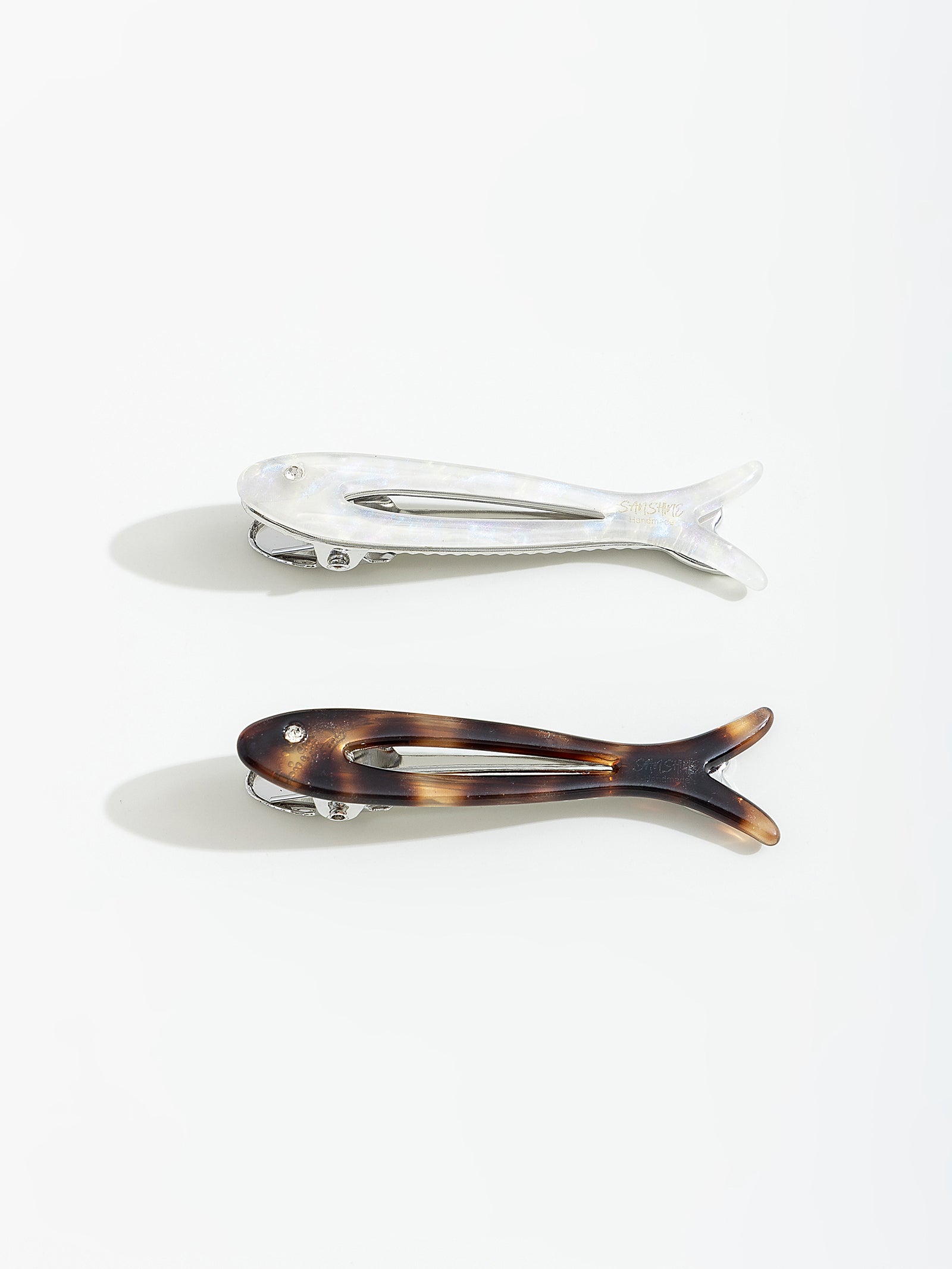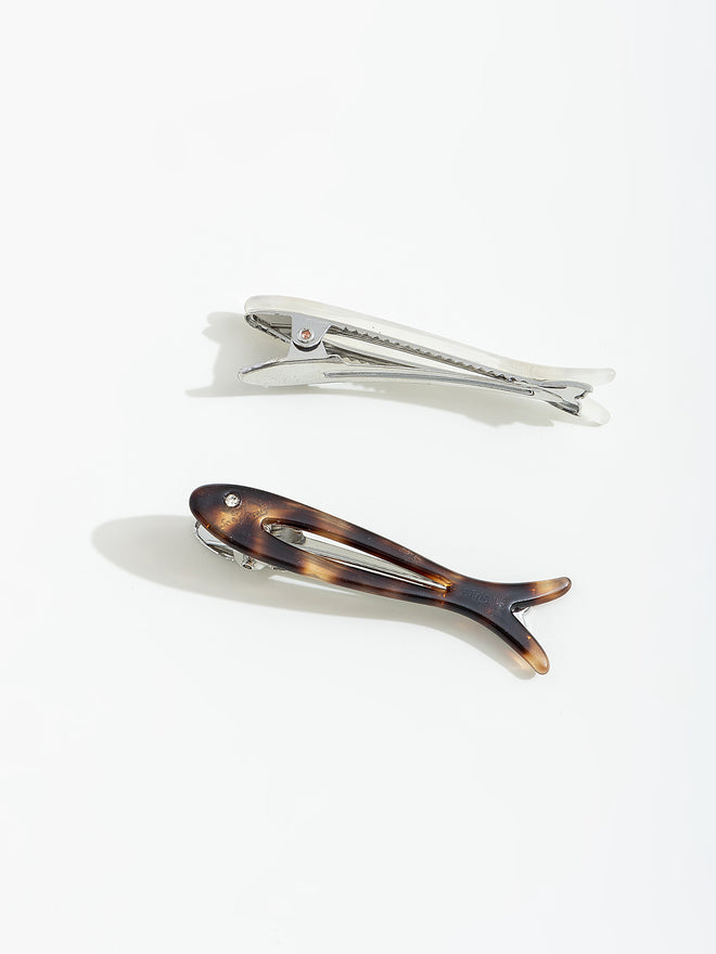 זוג סיכות לשיער בצורת דג בצבעים שונים.