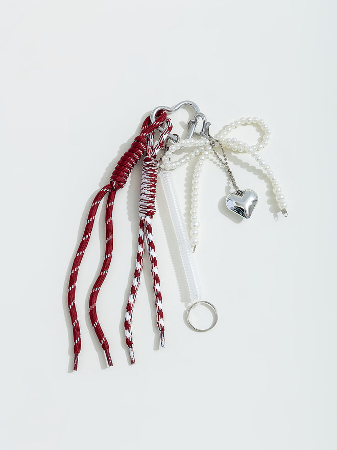 מחזיק מפתחות בשילוב חרוזים, חוטים ולב.