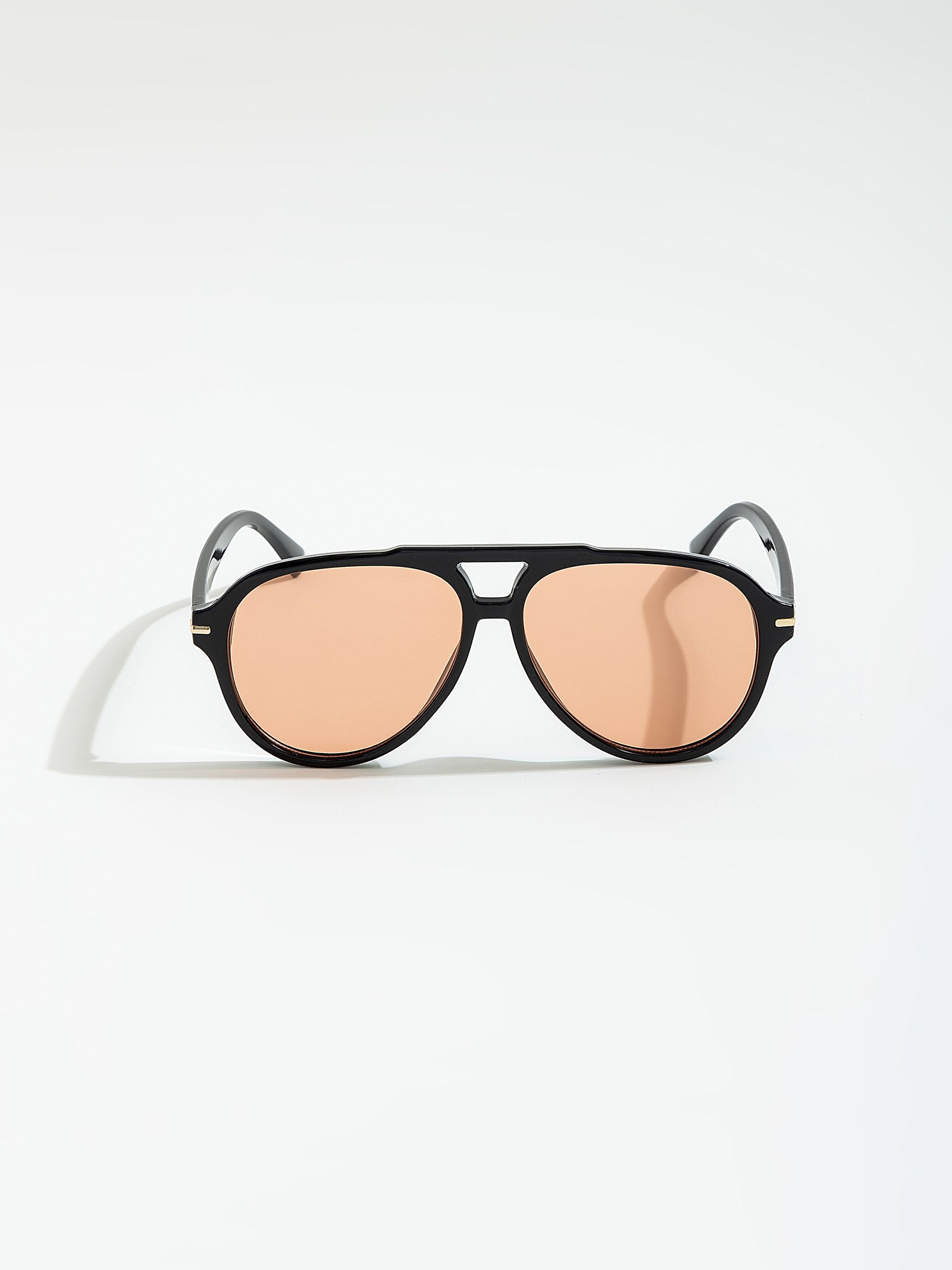 משקפי שמש טייסים עם מסגרת שחורה דקה ועדשות ורודות.