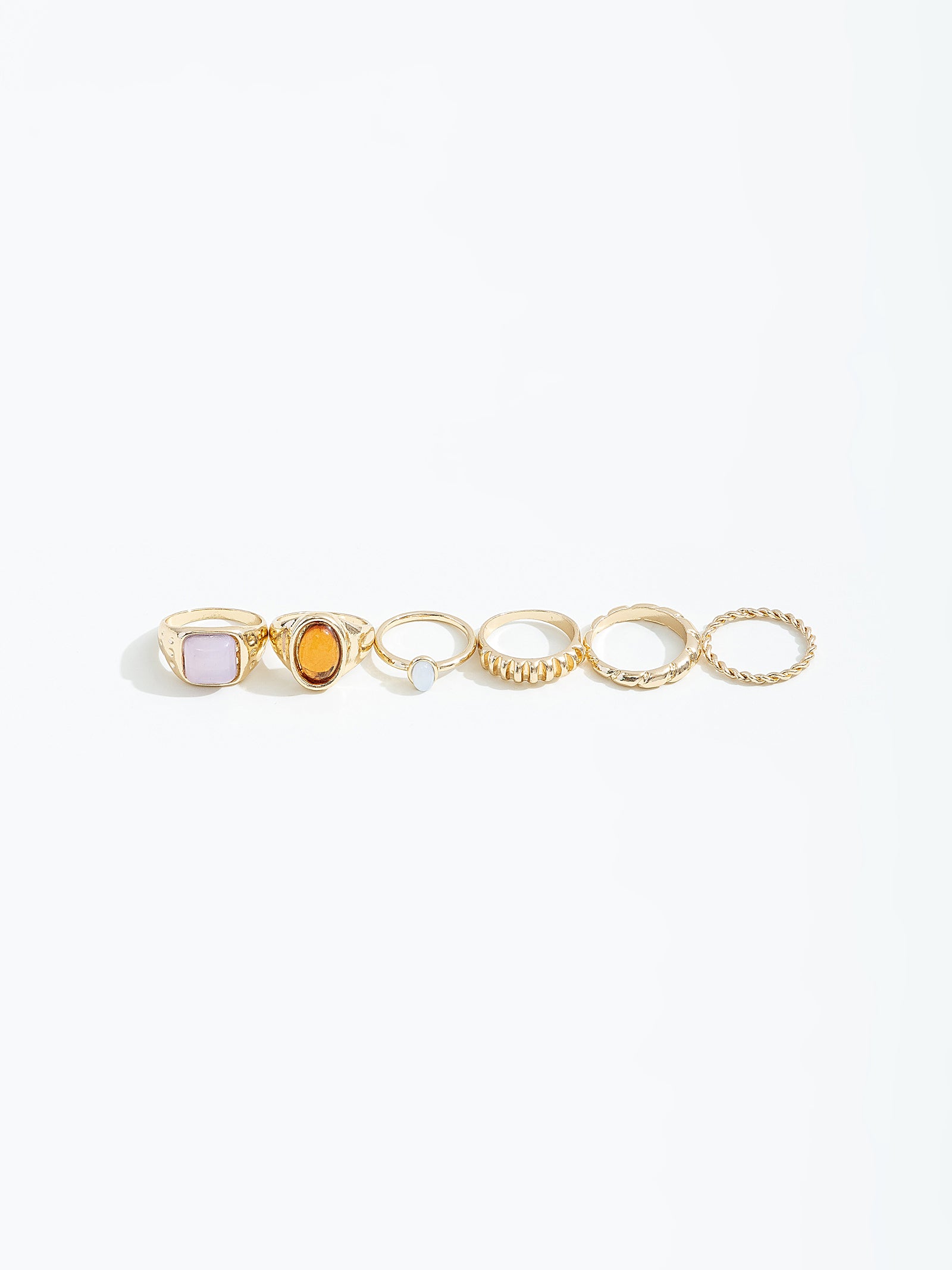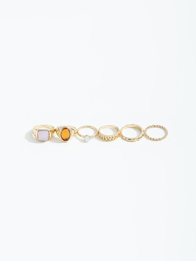 סט של 6 טבעות בעוביים שונים בשילוב אבנים.