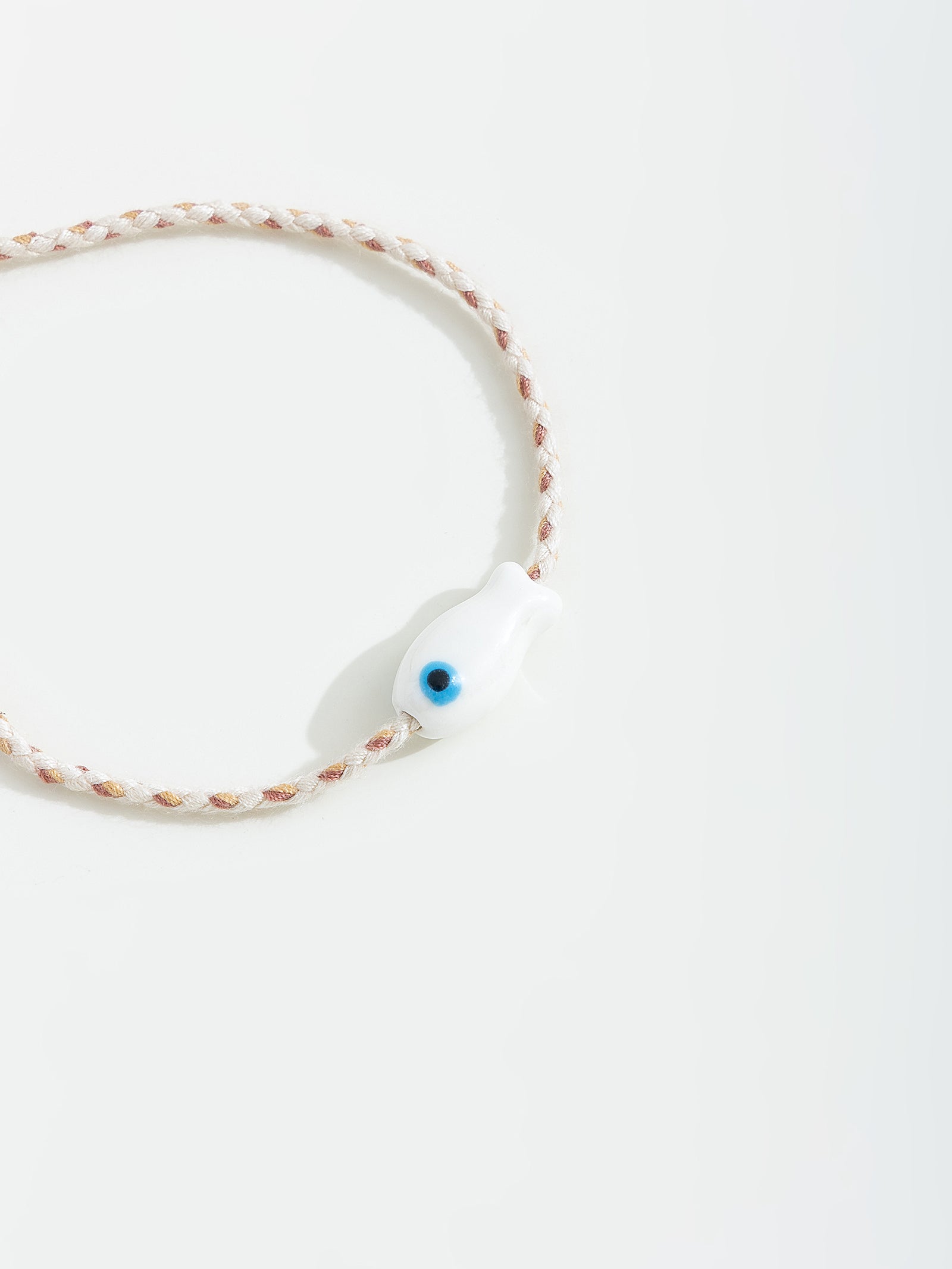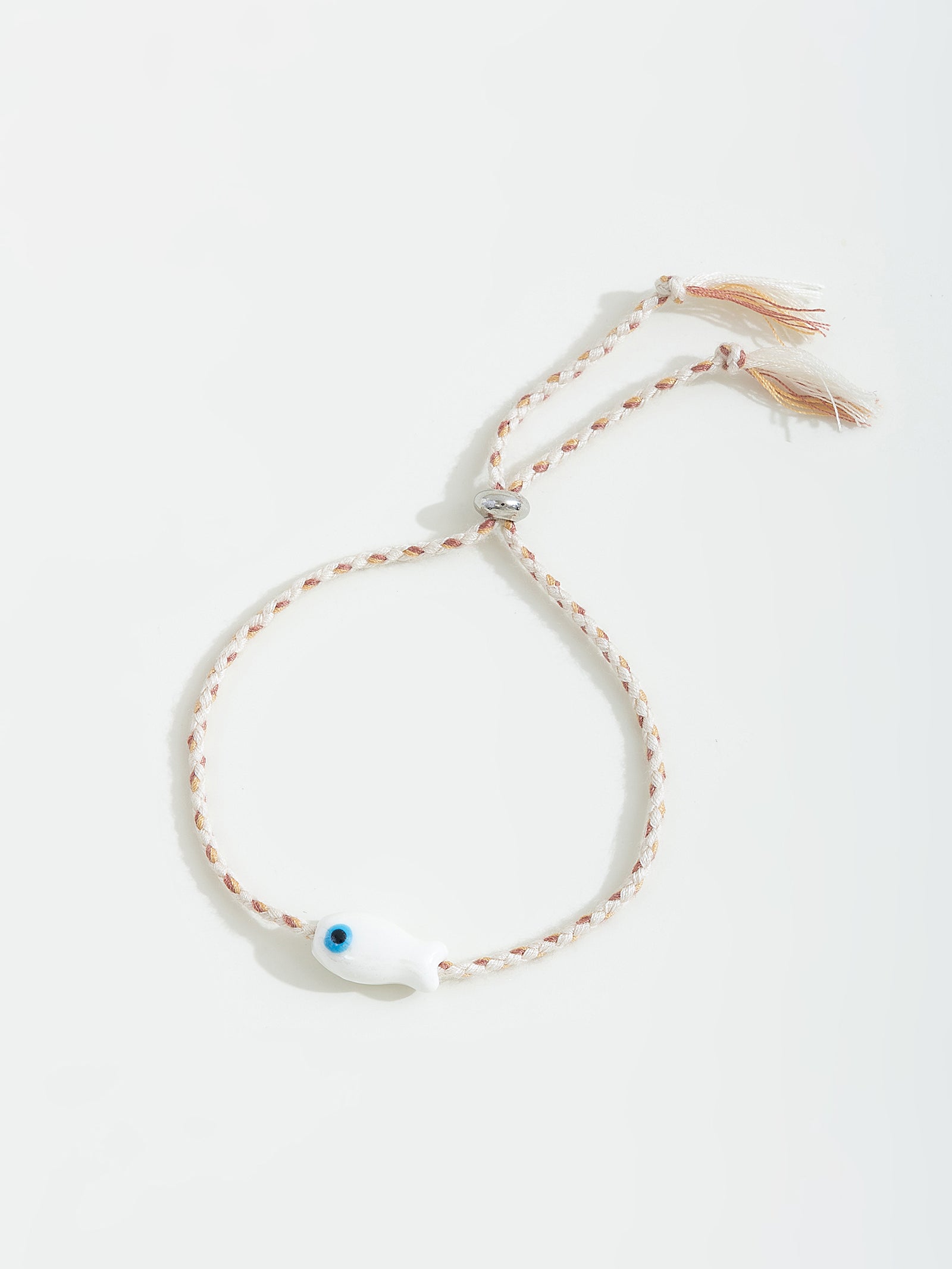 צמיד מתכוונן בצבע לבן על חוט עם דג קטן