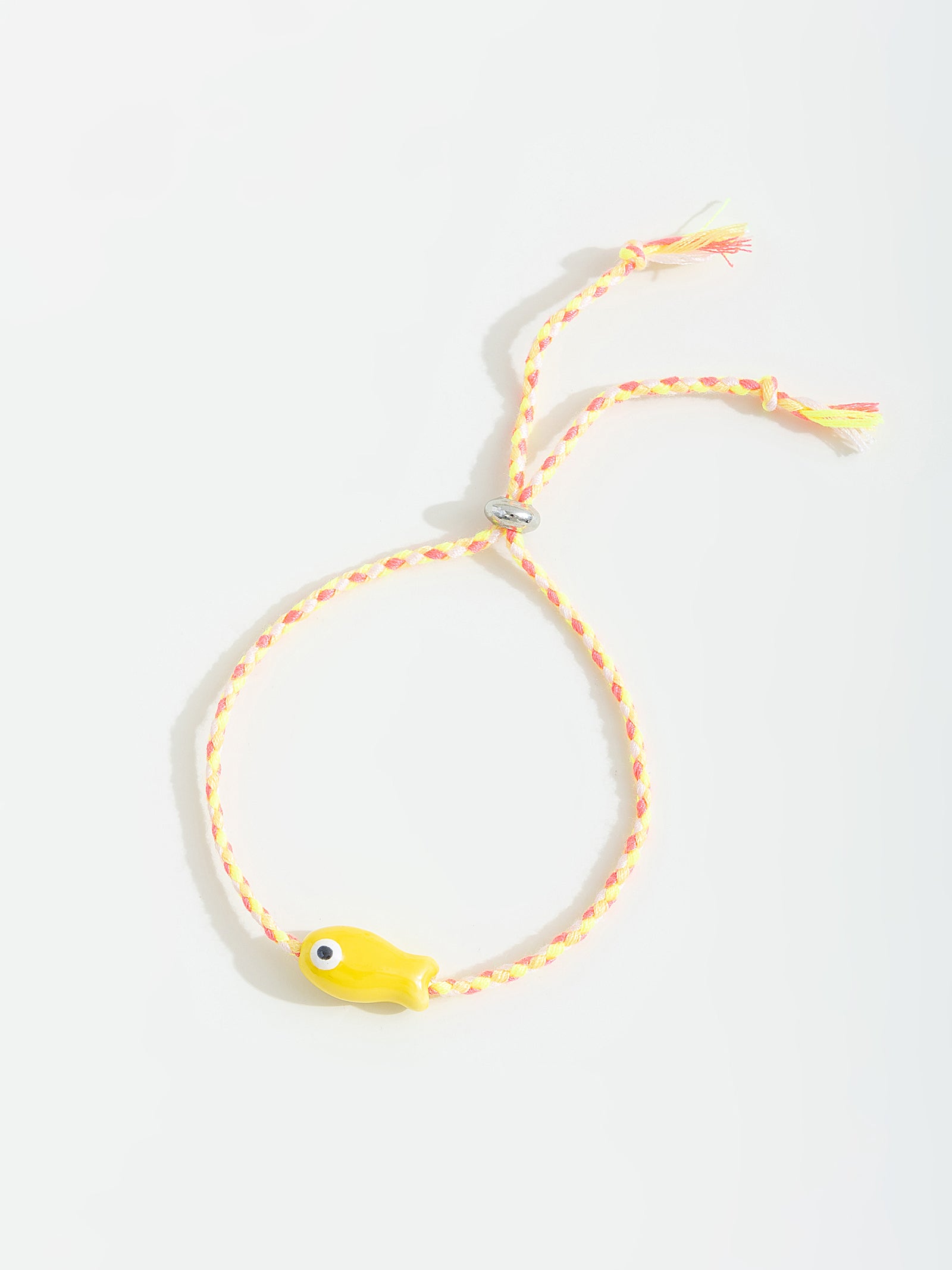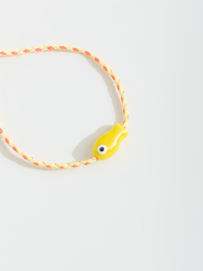 צמיד מתכוונן בצבע צהוב על חוט עם דג קטן.
