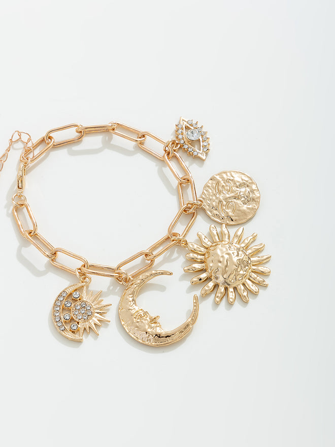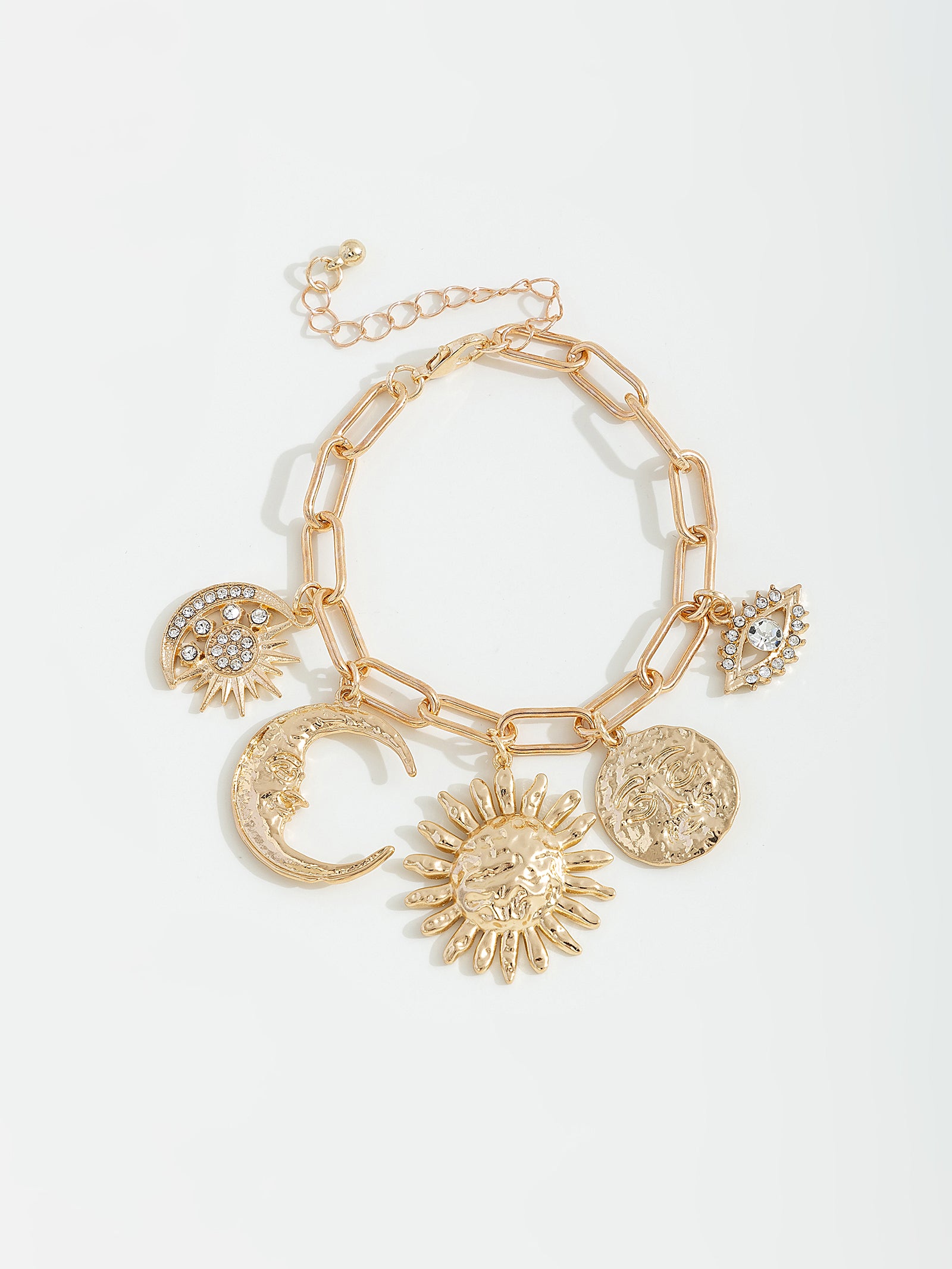 צמיד בשילוב תליונים בצורת שמש, ירח וכוכבים עם שיבוץ.