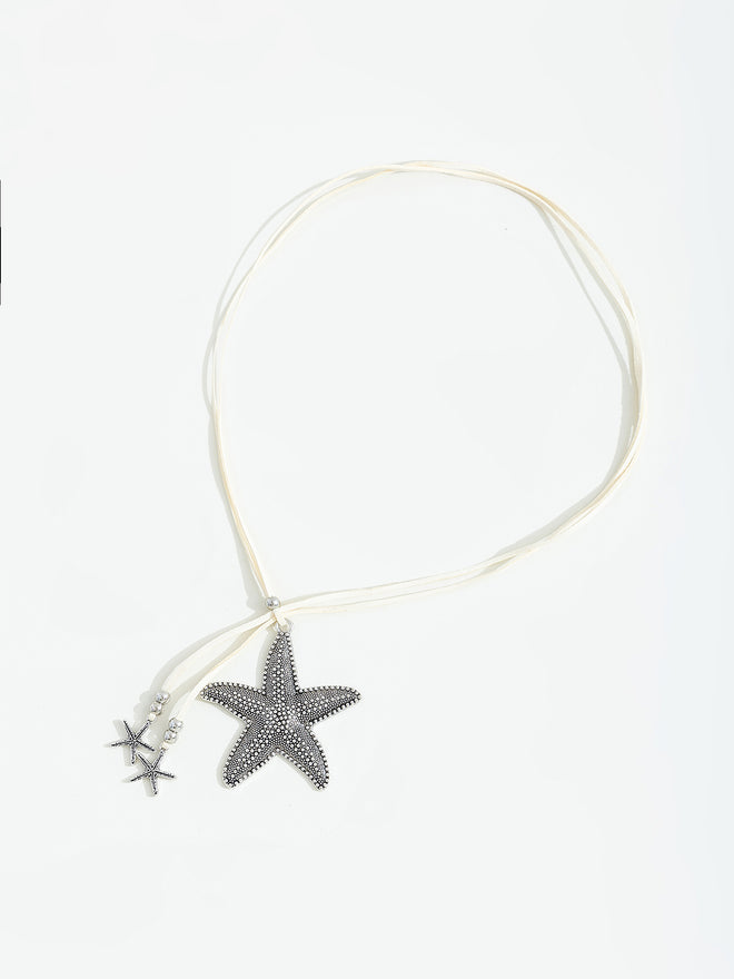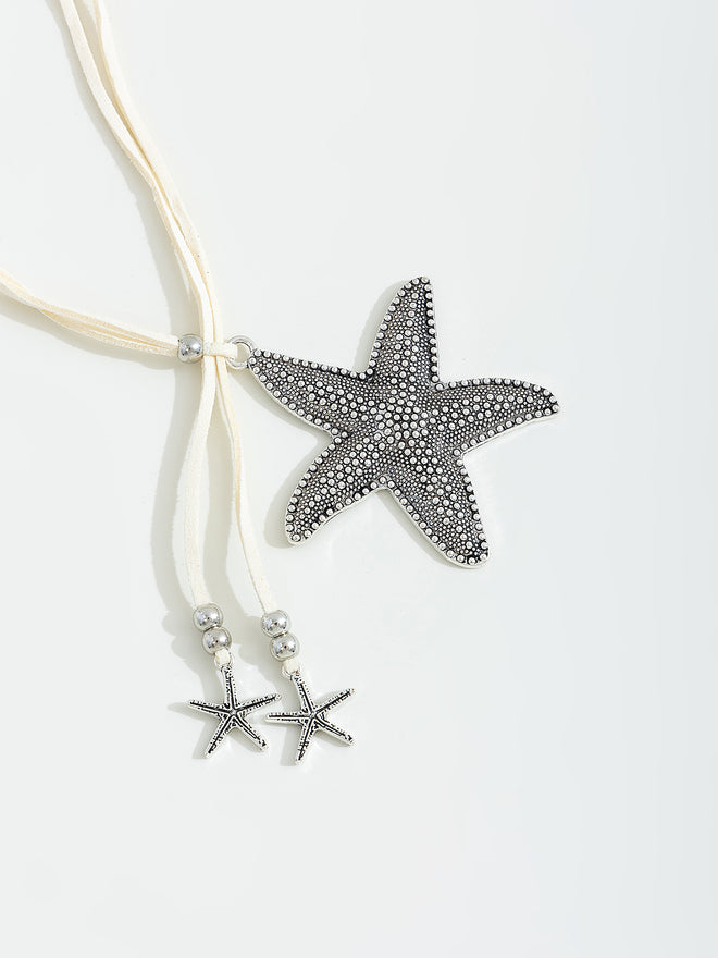 שרשרת-צ'וקר עם תליון גדול בצורת כוכב ים ושני תליונים כוכבי ים קטנים על חוט לבן.